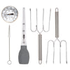 Complete 5-piece set includes: turkey baster with silicone bulb, cleaning brush, 2 stainless steel lifting forks, and pen-style thermometer with protective cover